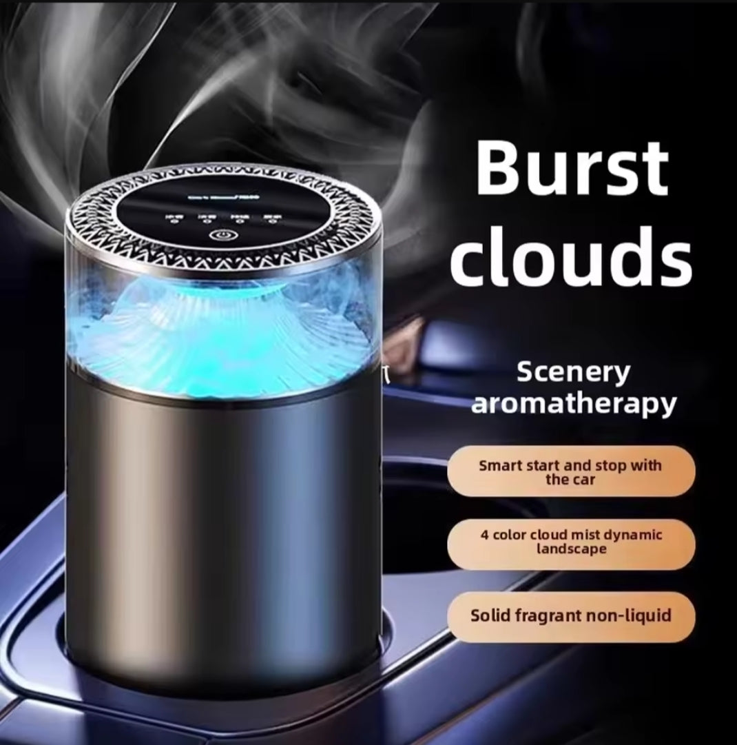 Smart car fragrance dispenser with automatic sensing technology. Releases scent intelligently based on driving conditions—no manual adjustments needed. Features three modes: Driving, Sleep, and Purification, controlled via app or buttons. Sleek metallic design with ambient LED lighting fits seamlessly into any vehicle interior. Charges fully in 3 hours with 30-day battery life per charge. Food-grade silicone reservoir is leak-proof and safe for families. Made with natural plant-based essential oils, alcohol-free and non-toxic.